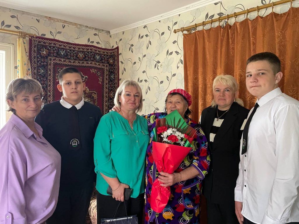 И. А. БЕЛЬКОВИЧ, председатель первичной профсоюзной организации Глушакова Ж. А., заместитель директора по воспитательной работе Савончук Н. Д., учителя и учащиеся 9 класса поздравили с 85-летним юбилеем бывшего работника учреждения Буракову Марию Анисимовну и пожелали ей здоровья, долгих лет жизни, счастья и мирного неба