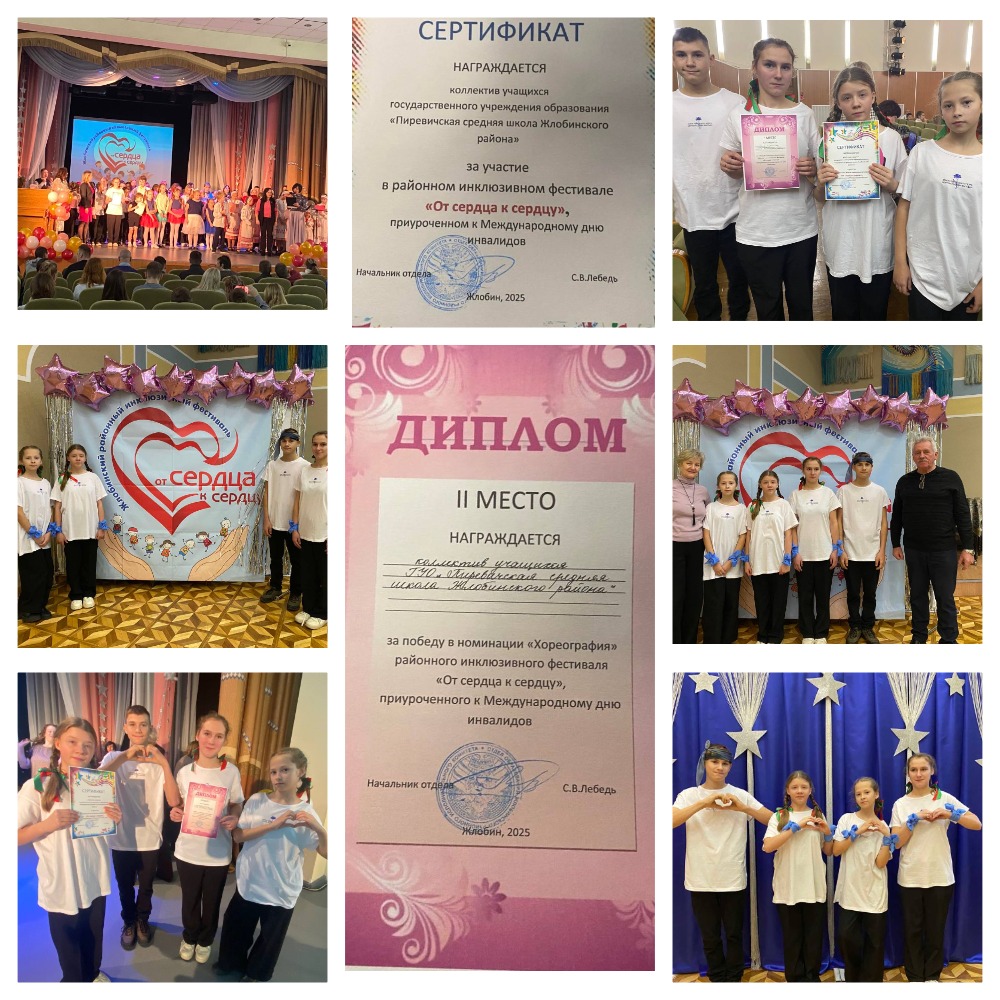 Учащиеся Пиревичской средней школы приняли участие в районном инклюзивном фестивале «От сердца к сердцу», приуроченный к Международному Дню инвалидов. Наши ученики заняли 2 место и получили сертификат за участие в фестивале.