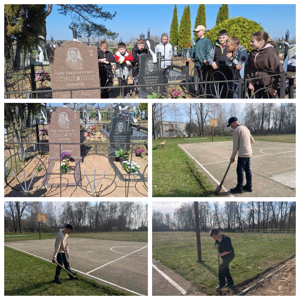Учащиеся Пиревичской средней школы приняли участие в субботнике. Очищена от мусора территории захоронения Героя Советского Союза Анатолия Баженова и приведена в порядок территория школьного стадиона.