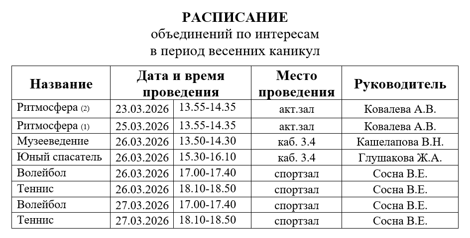Расписание объединений по интересам