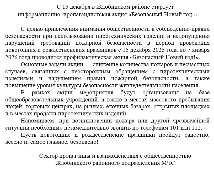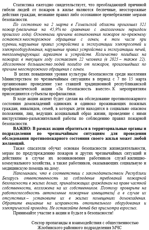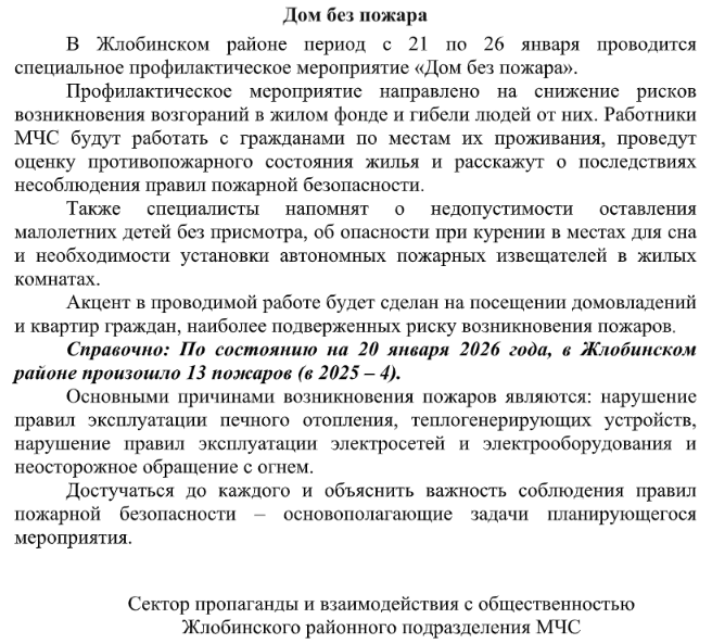 В рамках профилактических мероприятий представители МЧС, органов внутренних дел, труда и социальной защиты,образования, жилищно-коммунального хозяйства, здравоохранения, энергетики и представители Белорусского добровольного пожарного общества будут проводить обследования жилых помещений граждан для выявления факторов, влияющих на безопасность жизнедеятельности.