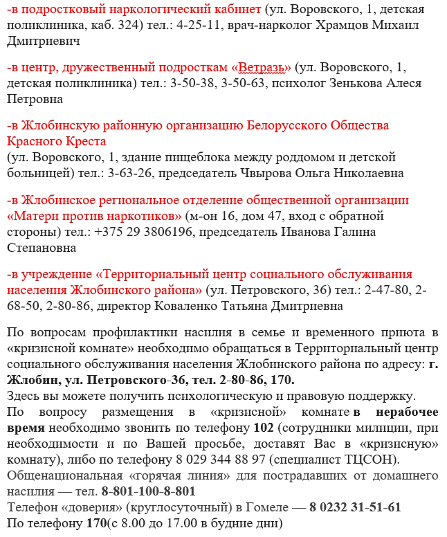 – Информация о действующих службах, оказывающих медицинскую, социальную и психологическую помощь в кризисных состояниях, в том числе экстренную психологическую помощь: